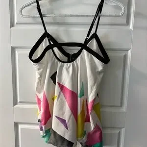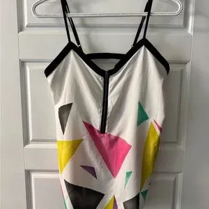 Vibrant women's top featuring a geometric design with pink, yellow, and black accents. Perfect for adding a pop of color to your wardrobe.