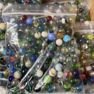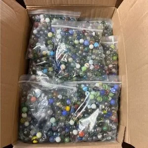 A vibrant collection of glass marbles in various colors. Perfect for games, crafting, collecting or decoration. Each bag is no less than 1kg ( about 3 cups of marbles per bag ) there is 34 bags.