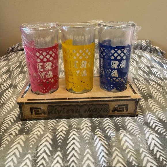 Vibrant glass set featuring red, yellow, and blue glasses. Comes with a wooden holder.
