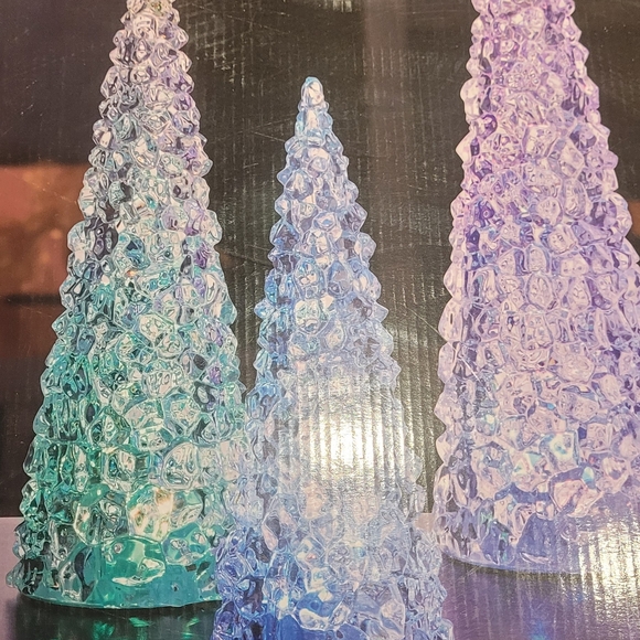 Set of three glass tree decorations in vibrant colors. Perfect for adding a festive touch to any space.