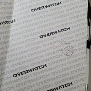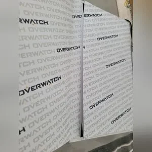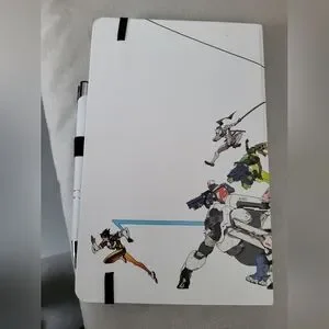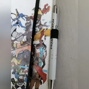 OverWatch vibrant notebook with dynamic character illustrations. Features a black elastic band for closure. 2 pages of writting where removed.