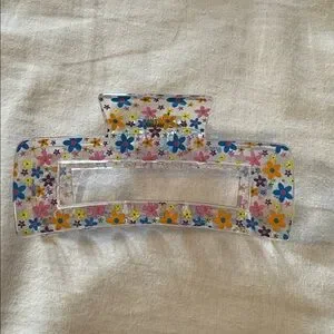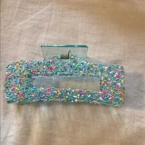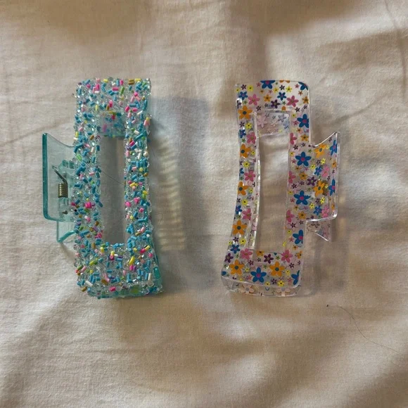 Set of two colorful hair clips. One features a beaded design with multicolor beads. The other has a floral pattern with blue and yellow flowers.