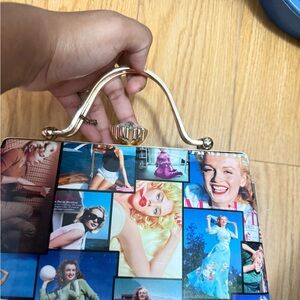 This vibrant handbag features a colorful collage design, perfect for adding a pop of color to any outfit. The unique style makes it a standout accessory.