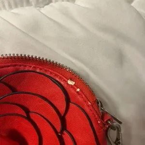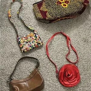 Set of four unique handbags. Includes a vibrant floral beaded bag, a patterned yellow and red tote, a brown leather shoulder bag, and a red rose-shaped purse. Perfect for adding variety to your accessory collection.