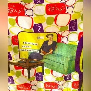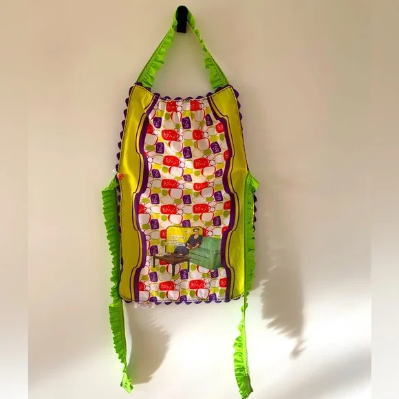 Vibrant handmade apron with playful patterns and ruffled edges. Features a mix of bright colors.