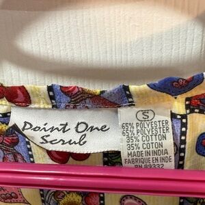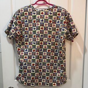 Vibrant scrub top with a heart pattern. Features a mix of colors including red, blue, and yellow with lower front pockets on each side.
