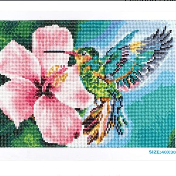 Create a vibrant masterpiece with this diamond painting kit featuring a colorful hummingbird and pink flower.