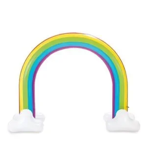 Vibrant inflatable rainbow arch with white cloud bases. Perfect for parties and events.