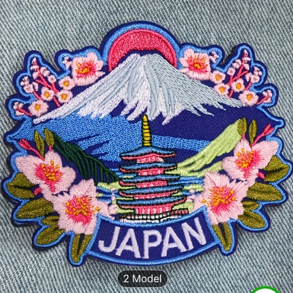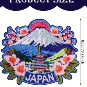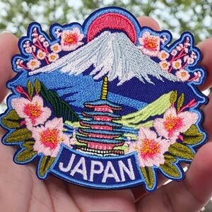 Vibrant embroidered patch featuring a Japanese landscape with cherry blossoms and Mount Fuji. Perfect for adding a unique touch to clothing or accessories.