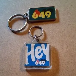 Set of two keychains with a retro design. Features bold colors and playful text.