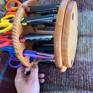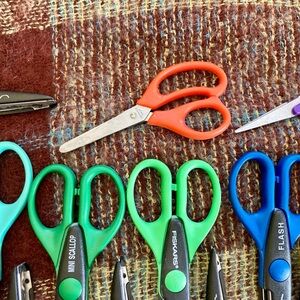 Brighten up craft time with this vibrant set of kids scissors. Perfect for creative projects. There are 17 pairs, one empty space so assuming one missing, not sure if all original brand, 2 pairs plain scissors and seems a bit of glue on them but not on cutting edge
