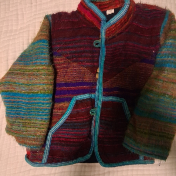 Vibrant and cozy kids jacket featuring a mix of colors. Fleece lining. Fit our daughter around 2-4 years old.