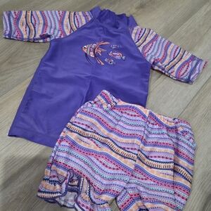 This playful kids rashguard set features a vibrant fish design on a purple top with multicolor striped sleeves and shorts. Ideal for sunny beach days.