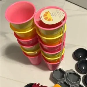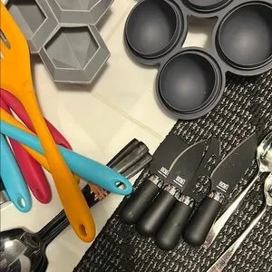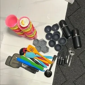 Vibrant kitchen utensil set with spatulas, measuring spoons, and more. Includes pink, orange, blue, and black items.