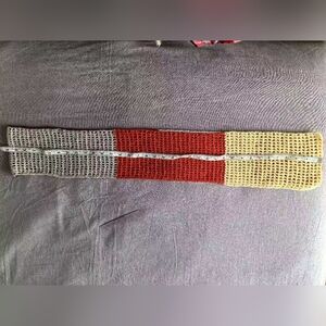 Add a pop of color to your outfit with this vibrant crochet scarf. Featuring a blend of red, orange, cream, and yellow, it's perfect for any occasion.