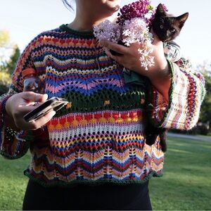 Vibrant knit sweater with a multicolor pattern. Features shades of pink, orange, green, and blue.