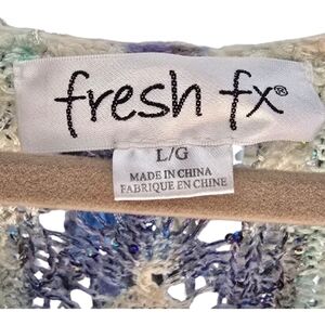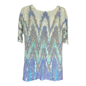 Stylish knit top with a vibrant pattern. Features shades of blue, green, and cream. Perfect for casual or dressy wear.