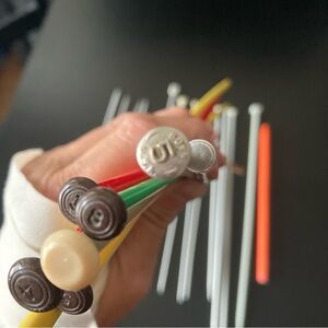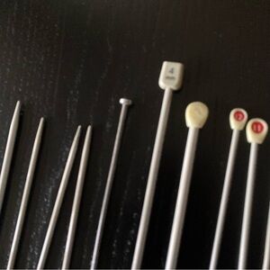 Set of colorful knitting needles. Includes silver, red, orange, yellow, and green needles.note that these needles are not matching pairs