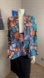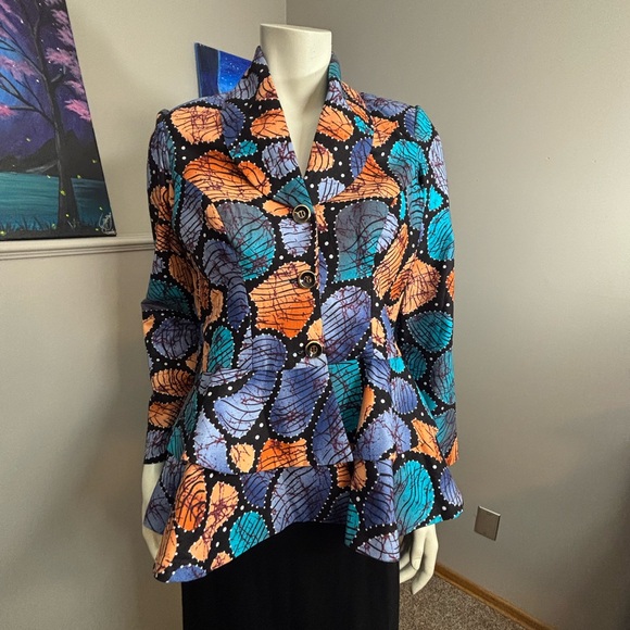 Vibrant blazer with a bold leaf pattern. Features shades of blue, orange, and black. Perfect for adding a pop of color to any outfit. African motives. Got it as a gift, I believe it’s handmade and no size is listed. I’m size 6-8 and it doesn’t fit at all, so I’d say size small or XS.