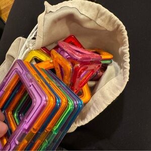 Set of colorful magnetic building tiles. Includes purple, orange, green, and blue pieces. Perfect for creative play.
