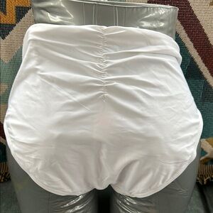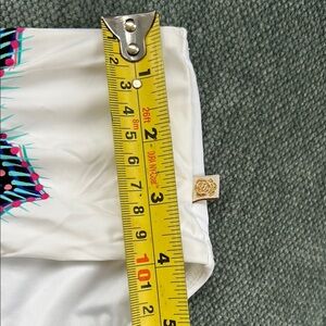Mid rise full back bikini bottoms with a vibrant mandala design. Features a mix of blue, pink, and black colors on a white base. It has slight ruching at the bum and seams where the print meets the white at front to give slight ruching. Hipster style.