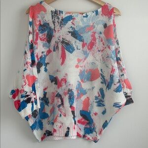 Embrace a vibrant look with this off-the-shoulder sweater, featuring a dynamic mix of red, blue, and white. Perfect for adding a splash of color to your wardrobe.