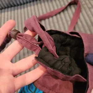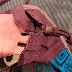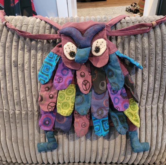 Vibrant cotton owl purse with multicolored feathers in shades of purple, blue, and green. Super cute!