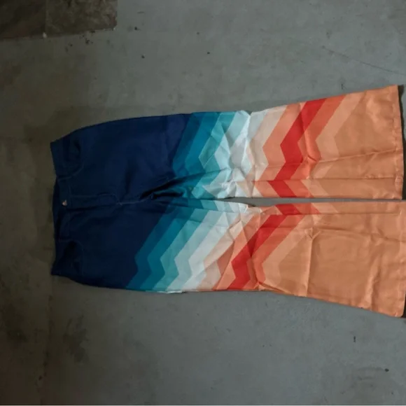 Brand New! Brighten up your wardrobe with these colorful chevron pants. Featuring a vibrant mix of blue, white, and orange, these bottoms are perfect for any day. Selling because they don’t fit and the company won’t return them