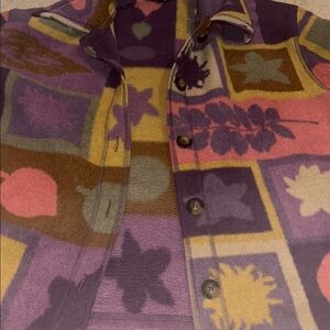 Vibrant patchwork jacket with leaf patterns. Features purple, pink, and brown tones.