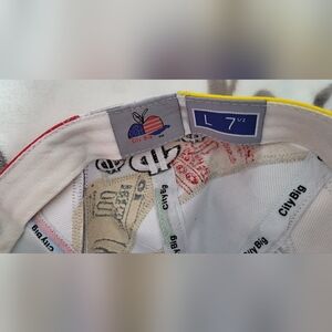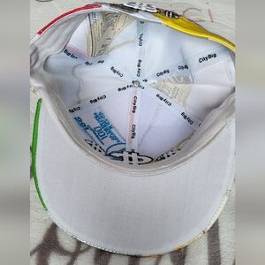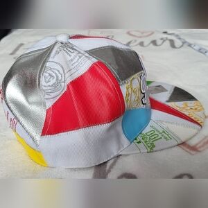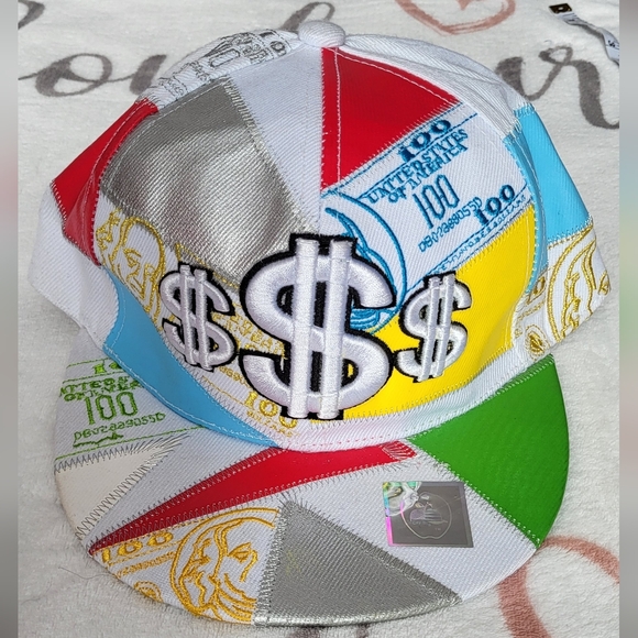 Vibrant cap featuring a patchwork design with a bold dollar sign. Includes colors like blue, yellow, green, and silver.