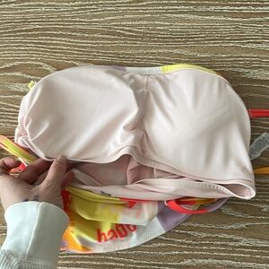Vibrant patchwork crop top with adjustable straps. Features playful text and a mix of colors.