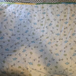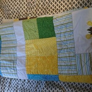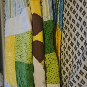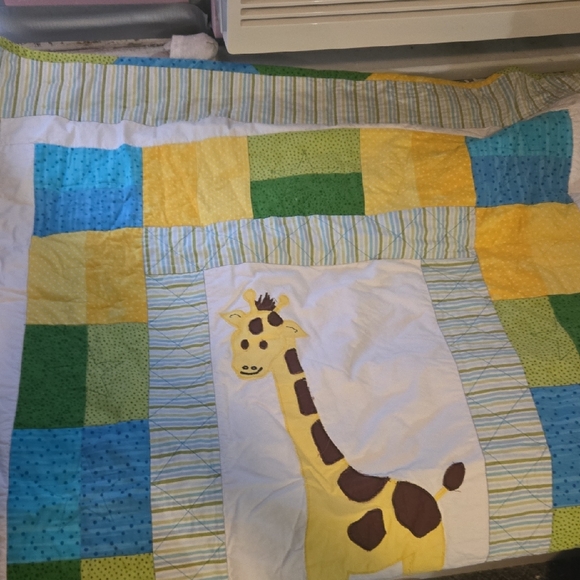 Brighten up your child's room with this colorful patchwork quilt featuring a playful giraffe design. The vibrant blue, green, and yellow colors create a cheerful atmosphere. Perfect for adding a touch of fun to any bedding ensemble.