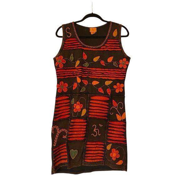 This vibrant sleeveless dress features a playful mix of colors, perfect for adding a pop of color to your wardrobe. The dress showcases a unique design with floral and abstract patterns, making it a standout piece for any occasion.