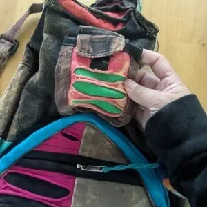Vibrant and unique, this colorful patchwork backpack is perfect for adding a splash of color to your outfit. Featuring a mix of blue, pink, and brown hues, it's both stylish and functional.
