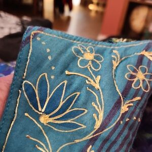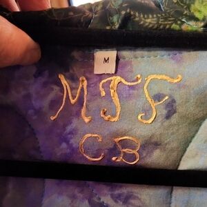 Vibrant patchwork jacket with intricate designs. Features shades of blue, green, and purple with gold designs.