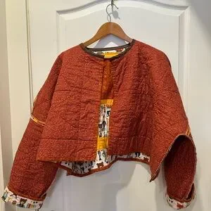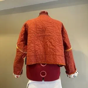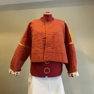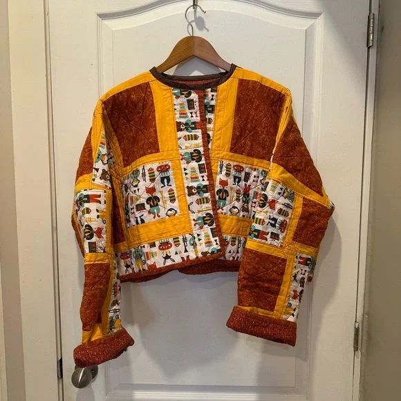 Vibrant patchwork jacket with unique patterns. Features orange and yellow accents.