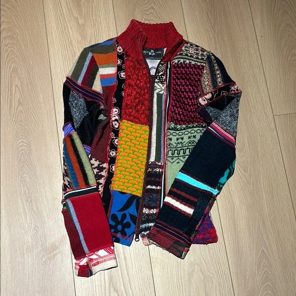 Vibrant patchwork knit jacket with a mix of patterns. Features a zip-up front and a variety of colors including red, blue, green, and black.