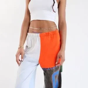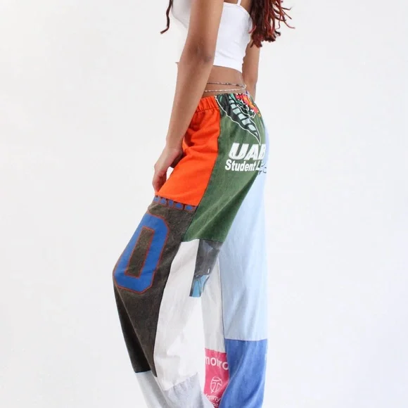 Vibrant patchwork lounge pants featuring a mix of colors. Perfect for a bold, casual look.
