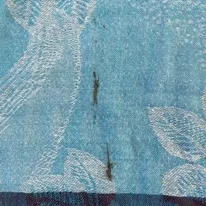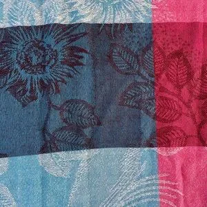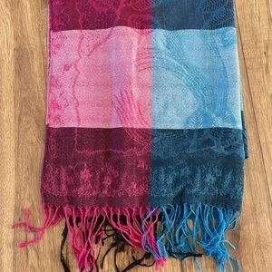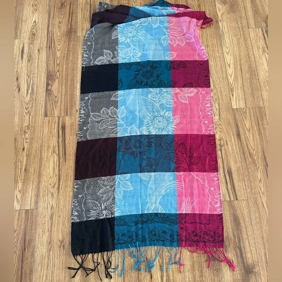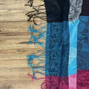 Turkish pashmina in blue, pink, and black. In good condition but there is a black mark/stain as shown in photos.