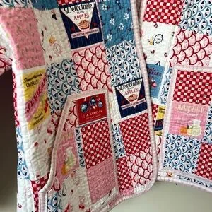 Homemade patchwork jacket featuring a playful patchwork design in pink, blue, and red. Perfect for adding a pop of color to any outfit.