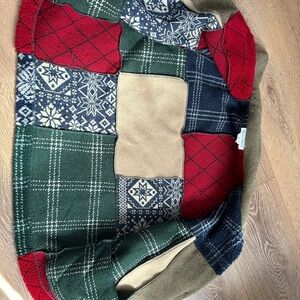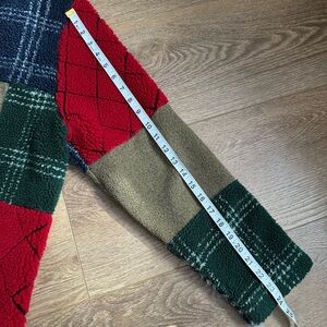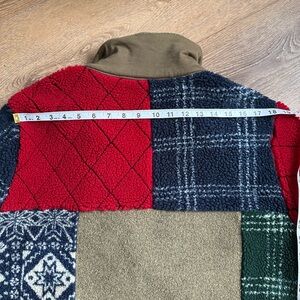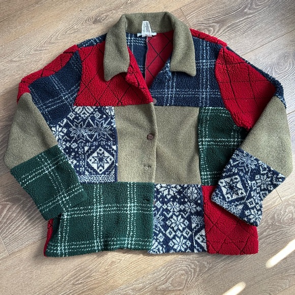 Embrace warmth and style with this colorful patchwork teddy jacket. Featuring a vibrant mix of red, green, blue, and tan, it's perfect for any casual outing. Great layering piece super cozy!