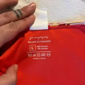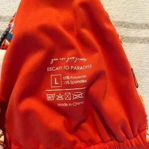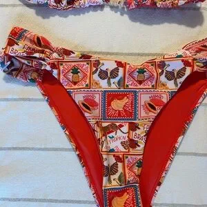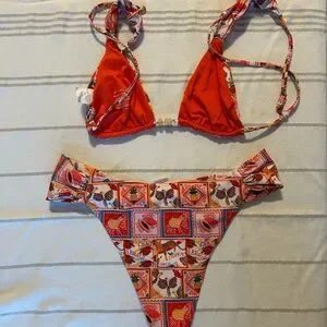 Vibrant bikini set with a colorful pattern. Features a halter top and matching bottoms.