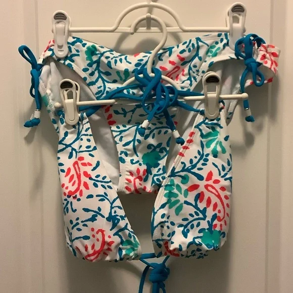 Vibrant bikini set with a colorful pattern. Features blue, red, and green designs on a white background.