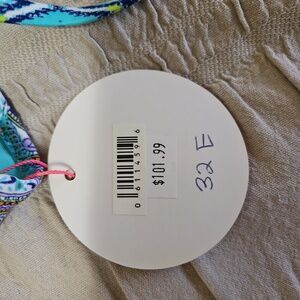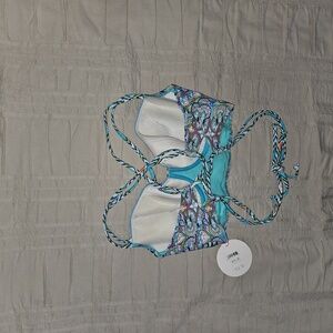 Vibrant bikini top with intricate patterns. Features a mix of blue, orange, and green colors.
