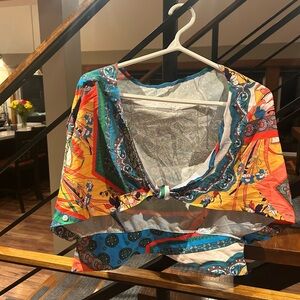 Vibrant blouse with intricate patterns. Features a mix of colors including green, red, blue, and orange. Perfect for a bold fashion statement.