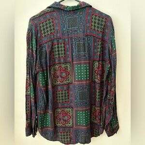 Vibrant button-up shirt with intricate patterns. Features a mix of green, red, and blue colors. Perfect for a bold fashion statement.