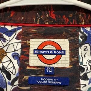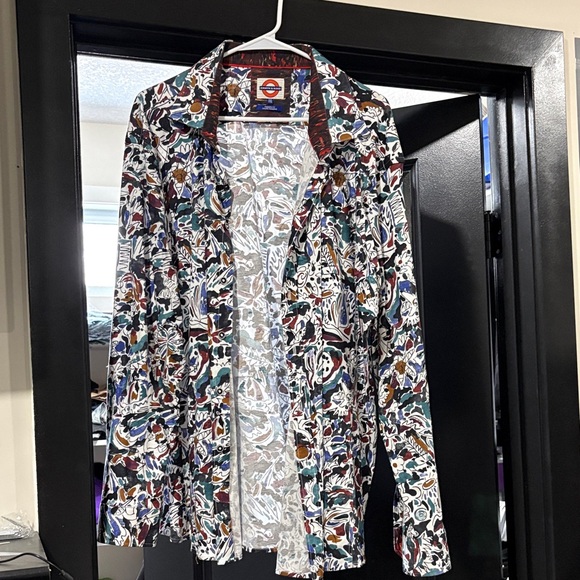 Vibrant button-up shirt with a multicolor abstract pattern. Features a mix of red, blue, green, and white colors.