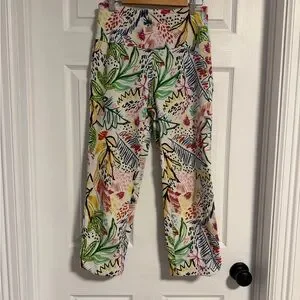 Vibrant capri pants with a colorful leaf and abstract pattern. Features shades of green, yellow, red, and blue. Up! brand with great stretch throughout and no buttons/zippers. 33” long.