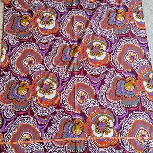 This vibrant vintage cotton canvas fabric features an eye-catching retro floral paisley design with rich jewel tones and classic 70s flair. The heavier cotton weave gives it structure while remaining easy to sew.