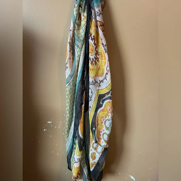 Vibrant scarf with intricate patterns. Features green, yellow, and teal hues.